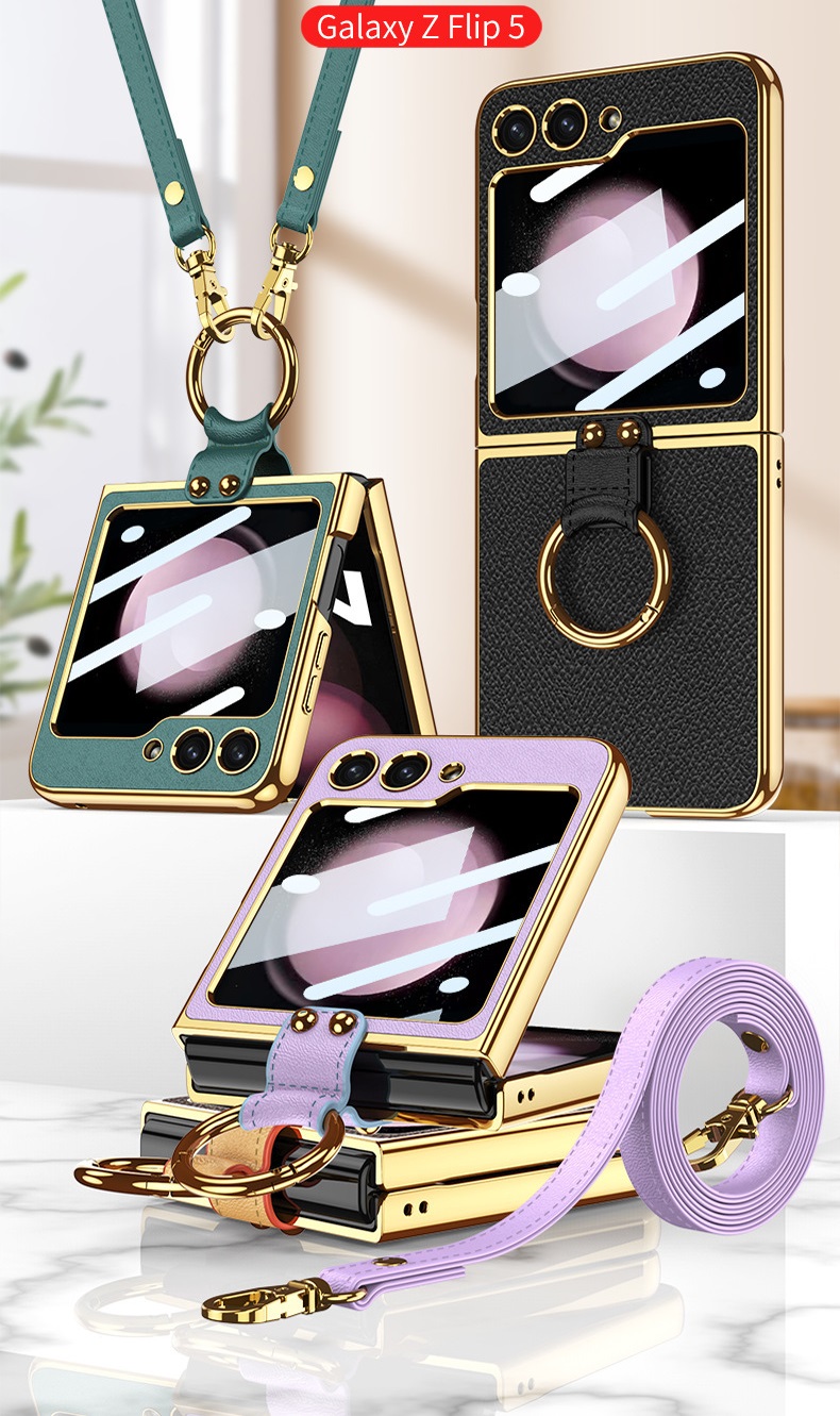หนังหุ้มหลังหน้าจอแบบหรูหราพร้อมกระจกกระด้างแข็งแรงและโครงส่วนแข็งสำหรับ Samsung Z Flip6/5/4/3 5G พร้อมเชือกคล้องคอ